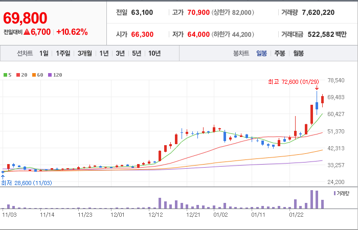 시총: 9조 1,110억원, 거래량:7,621,963, 거래대금:522,704백만