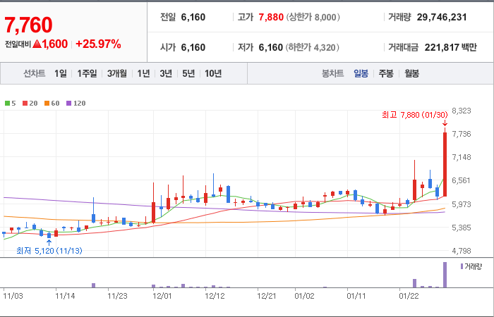 시총: 1,290억원, 거래량:29,746,502, 거래대금:221,819백만