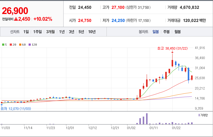 시총: 2,620억원, 거래량:8,169,451, 거래대금:234,481백만