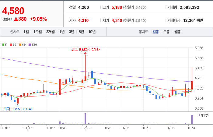 현재가: 4,580, 어제대비:+380