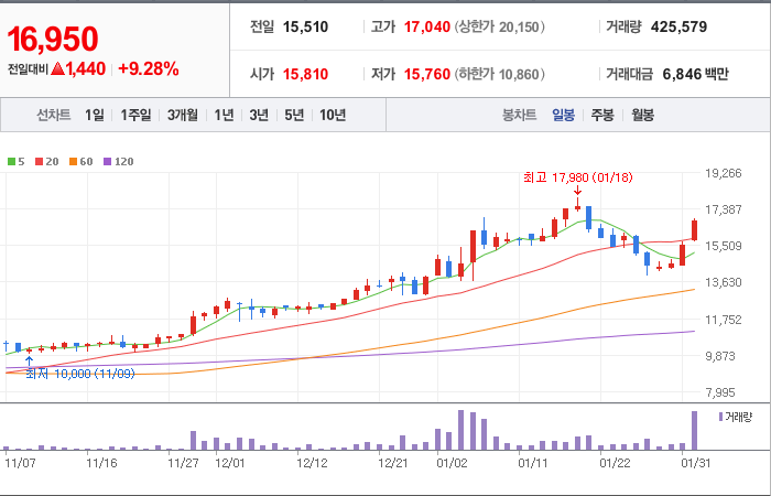 현재가: 16,920, 어제대비:+1,410