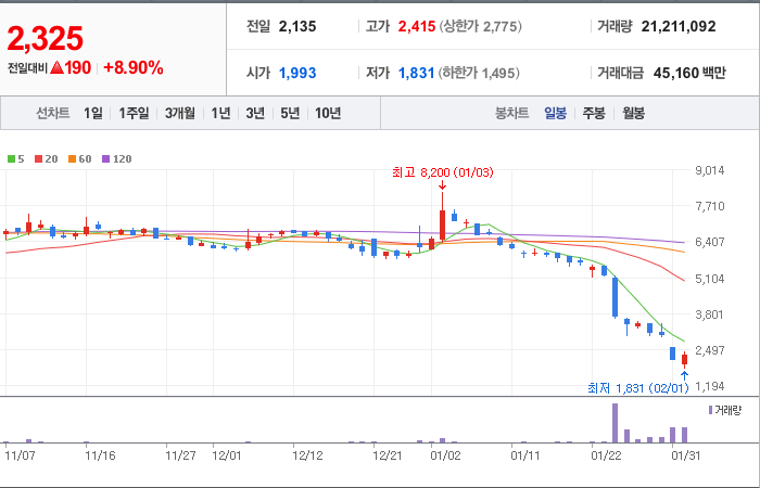 시총: 1,923억원, 거래량:21,286,907, 거래대금:45,336백만
