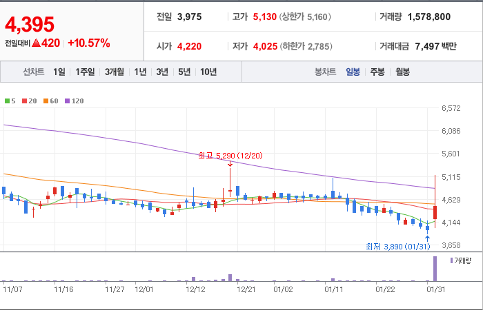 현재가: 4,365, 어제대비:+390