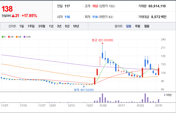 시총: 141억원, 거래량:24,681,531, 거래대금:98,318백만
