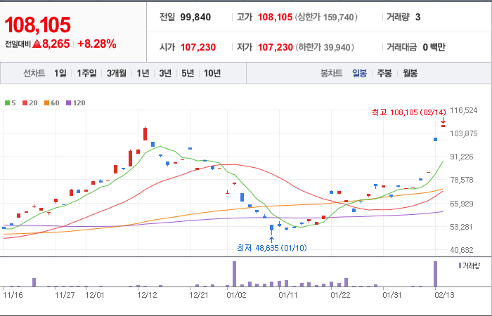 현재가: 108,105, 어제대비:+8,265