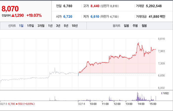 시총: 926억원, 거래량:5,292,548, 거래대금:41,880백만