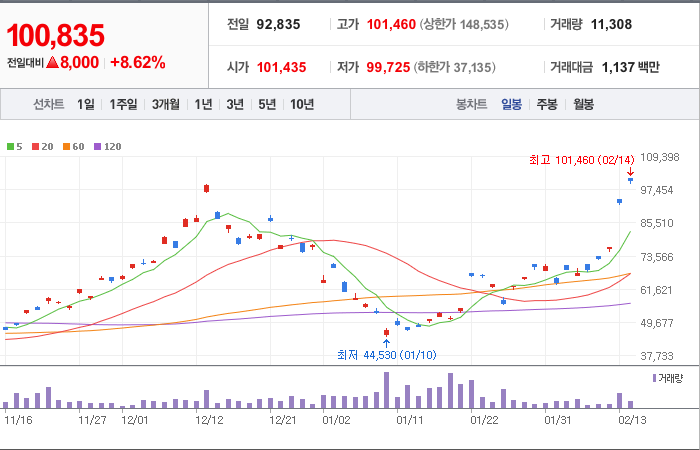 현재가: 100,835, 어제대비:+8,000