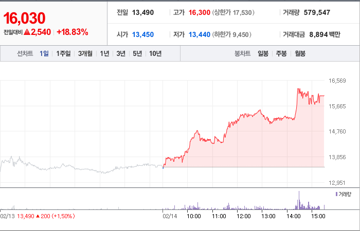 현재가: 16,030, 어제대비:+2,540