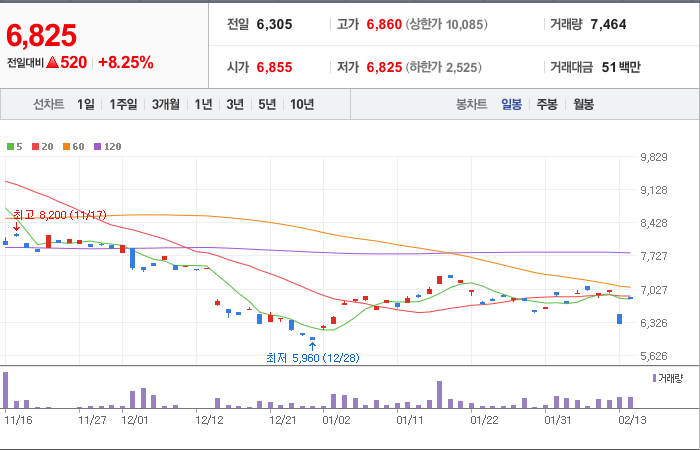 현재가: 6,825, 어제대비:+520