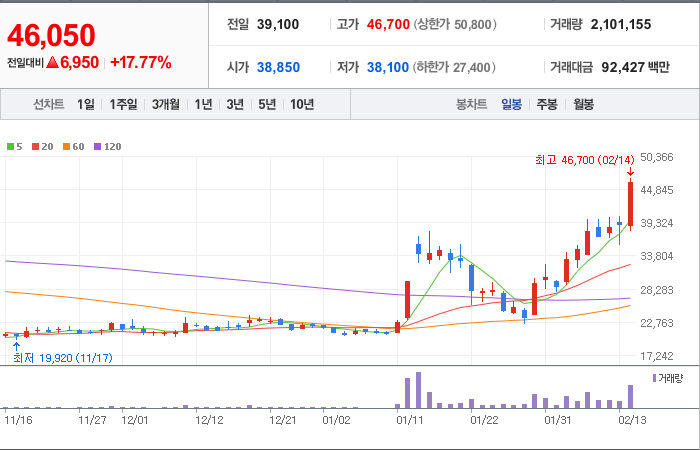 현재가: 46,050, 어제대비:+6,950