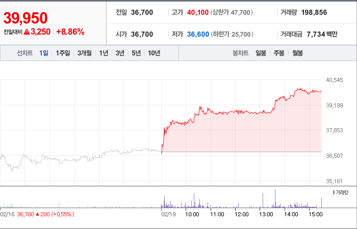 현재가: 39,950, 어제대비:+3,250
