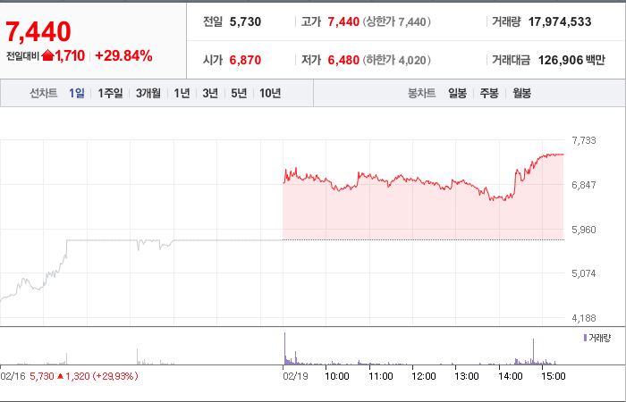 시총: 1,444억원, 거래량:17,974,533, 거래대금:126,906백만