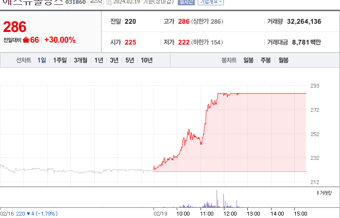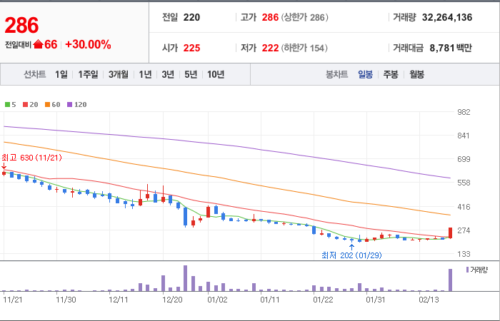 현재가: 286, 어제대비:+66