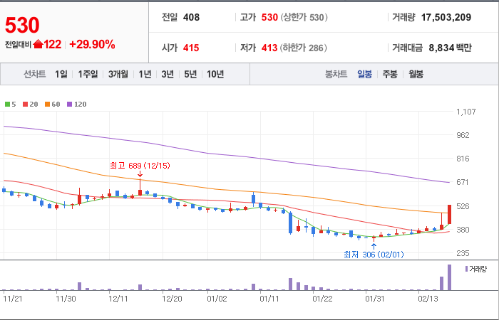 시총: 306억원, 거래량:17,503,209, 거래대금:8,834백만