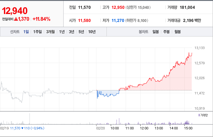 현재가: 12,940, 어제대비:+1,370시총: 1,013억원, 거래량:181,004, 거래대금:2,196백만
