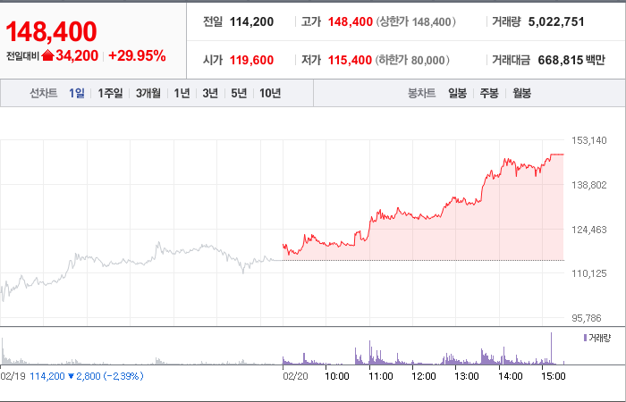 현재가: 148,400, 어제대비:+34,200시총: 4조 786억원, 거래량:5,022,751, 거래대금:668,815백만