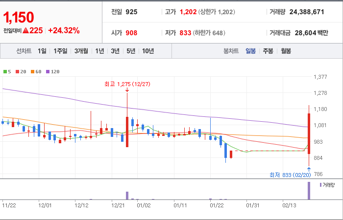 현재가: 1,150, 어제대비:+225시총: 500억원, 거래량:24,388,671, 거래대금:28,604백만