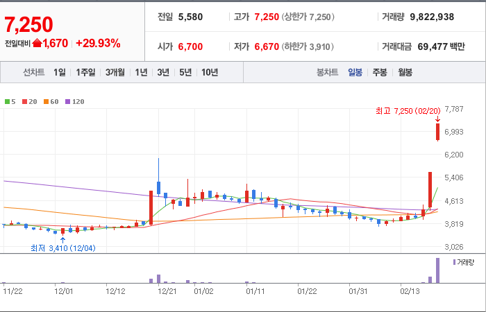현재가: 7,250, 어제대비:+1,670시총: 1,016억원, 거래량:9,822,938, 거래대금:69,477백만