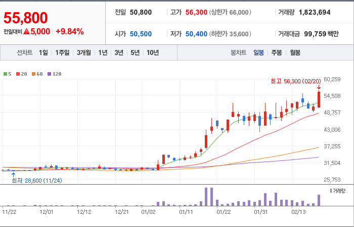 현재가: 55,800, 어제대비:+5,000시총: 1조 6,954억원, 거래량:1,823,694, 거래대금:99,759백만