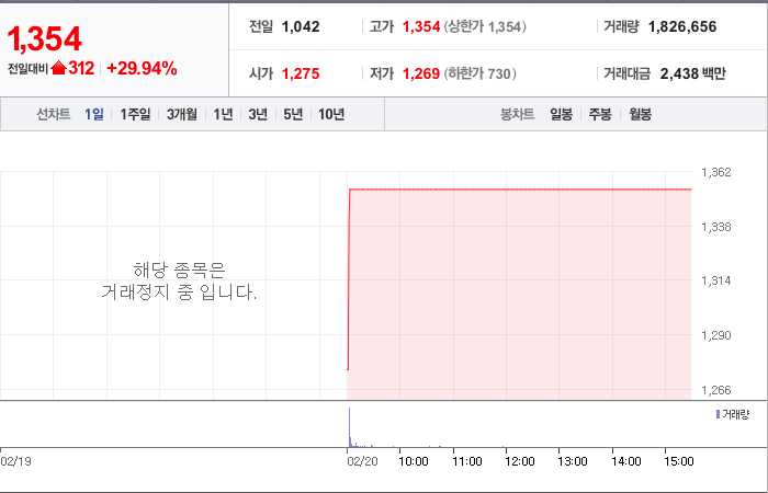 현재가: 1,354, 어제대비:+312시총: 734억원, 거래량:1,826,656, 거래대금:2,438백만