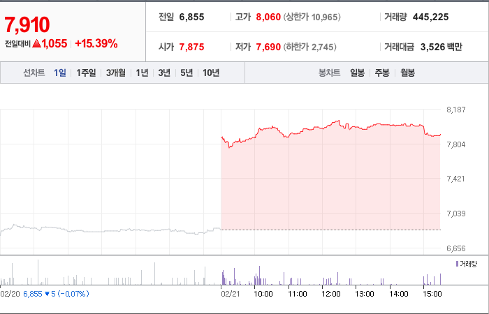 현재가: 7,910, 어제대비:+1,055시총: 396억원, 거래량:445,225, 거래대금:3,526백만