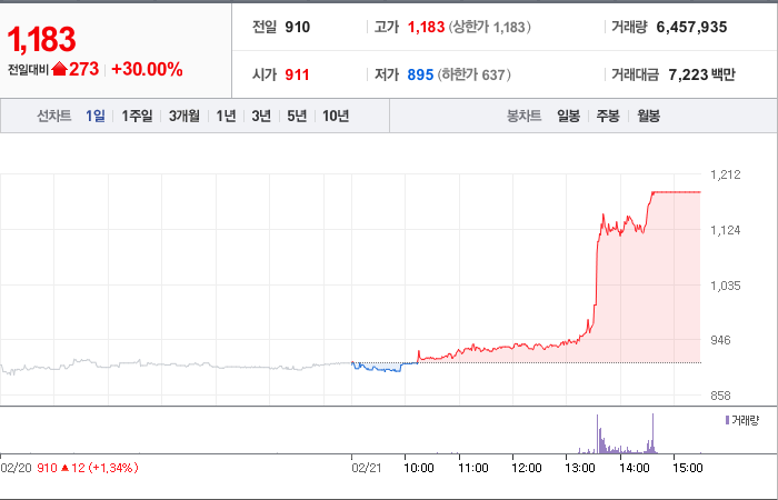 현재가: 1,183, 어제대비:+273시총: 409억원, 거래량:6,457,935, 거래대금:7,223백만