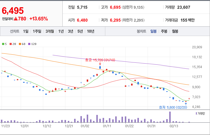 현재가: 6,495, 어제대비:+780시총: 65억원, 거래량:23,607, 거래대금:155백만