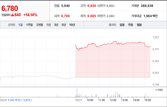 현재가: 6,780, 어제대비:+840시총: 170억원, 거래량:288,938, 거래대금:1,964백만