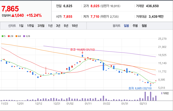 현재가: 7,865, 어제대비:+1,040시총: 393억원, 거래량:436,650, 거래대금:3,439백만