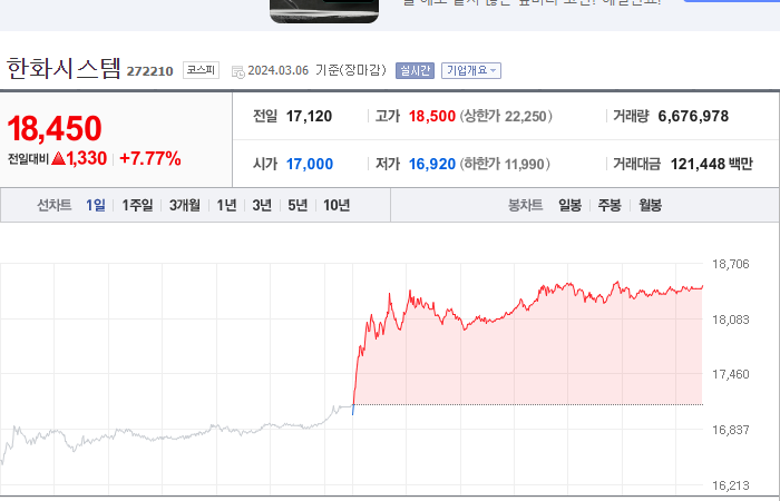7. 한화시스템 등락률: +7.77%