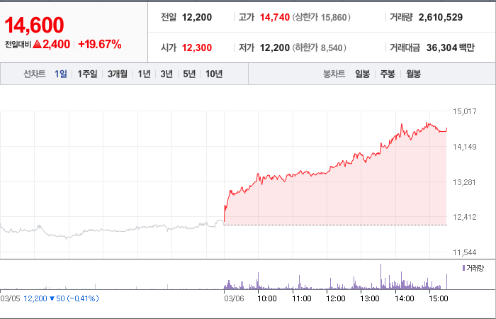 현재가: 14,600, 어제대비:+2,400시총: 8,446억원, 거래량:2,610,529, 거래대금:36,304백만