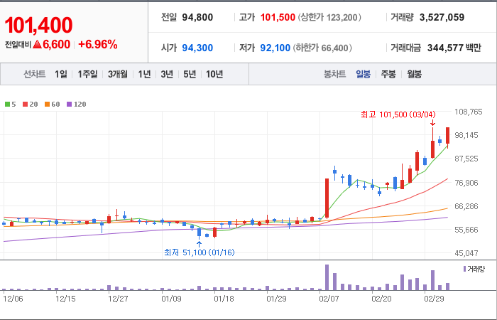 현재가: 101,400, 어제대비:+6,600시총: 9조 8,702억원, 거래량:3,527,059, 거래대금:344,577백만