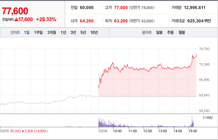 현재가: 77,600, 어제대비:+17,600시총: 2조 1,821억원, 거래량:12,996,611, 거래대금:925,304백만