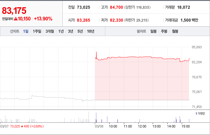 현재가: 83,175, 어제대비:+10,150시총: 1,664억원, 거래량:18,072, 거래대금:1,500백만
