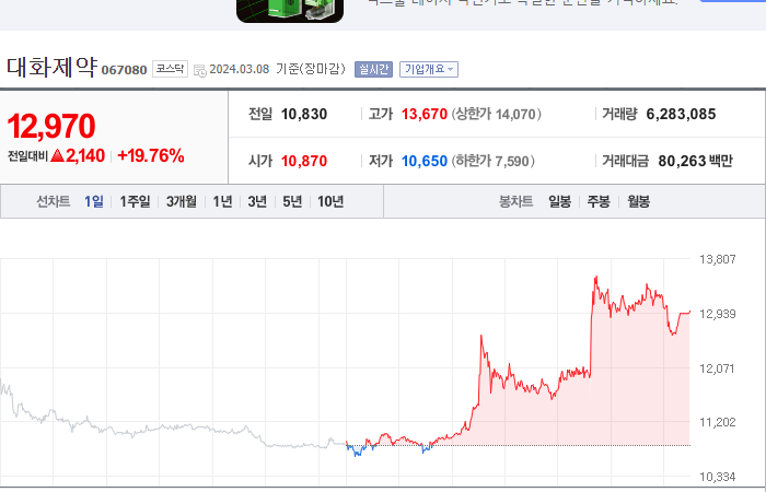 현재가: 13,690, 어제대비:+2,720시총: 4,348억원, 거래량:10,242,550, 거래대금:134,909백만