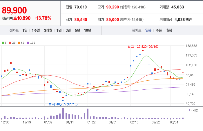현재가: 89,900, 어제대비:+10,890시총: 4,495억원, 거래량:45,033, 거래대금:4,038백만