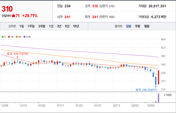 현재가: 310, 어제대비:+71시총: 211억원, 거래량:20,917,351, 거래대금:6,273백만