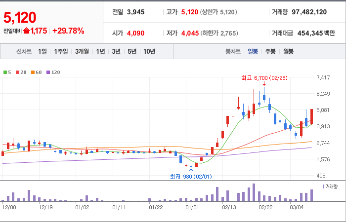 현재가: 5,120, 어제대비:+1,175시총: 2,868억원, 거래량:97,482,120, 거래대금:454,345백만