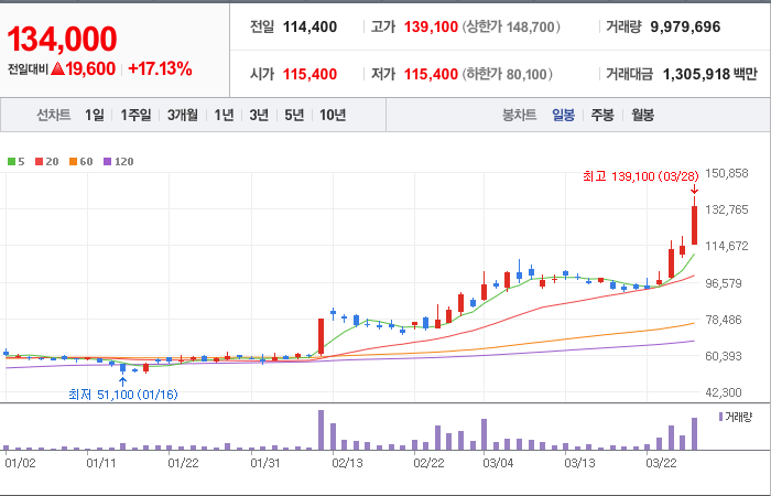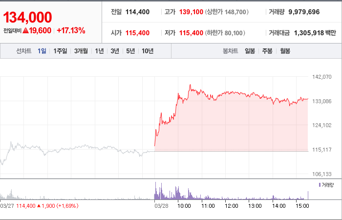 현재가: 134,000, 어제대비:+19,600시총: 13조 435억원, 거래량:9,979,6969,979,696, 거래대금:1,305,9181,305,918백만