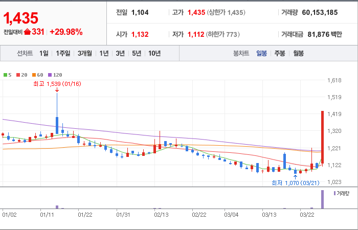 현재가: 1,435, 어제대비:+331시총: 806억원, 거래량:60,153,185, 거래대금:81,876백만