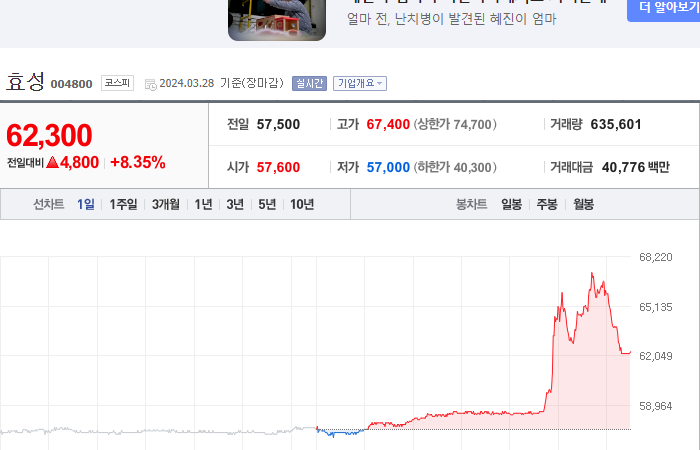 현재가: 62,300, 어제대비:+4,800시총: 1조 3,127억원, 거래량:635,601, 거래대금:40,776백만