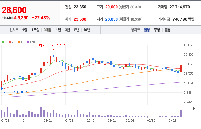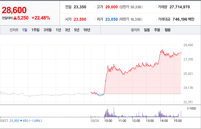 현재가: 28,600, 어제대비:+5,250시총: 9,851억원, 거래량:27,714,970, 거래대금:746,196백만