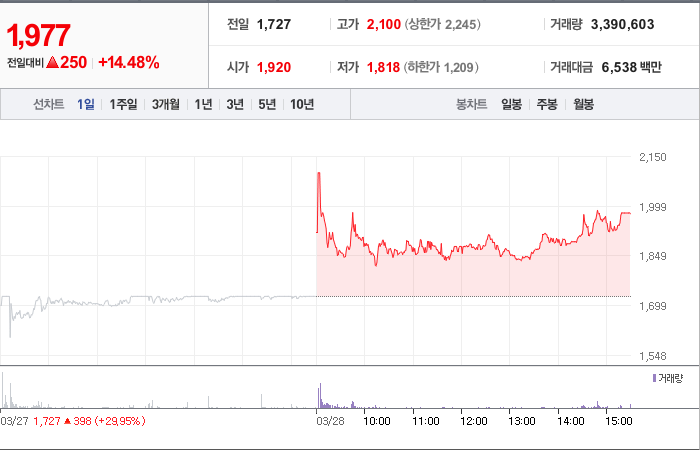 현재가: 1,977, 어제대비:+250시총: 841억원, 거래량:3,390,603, 거래대금:6,538백만