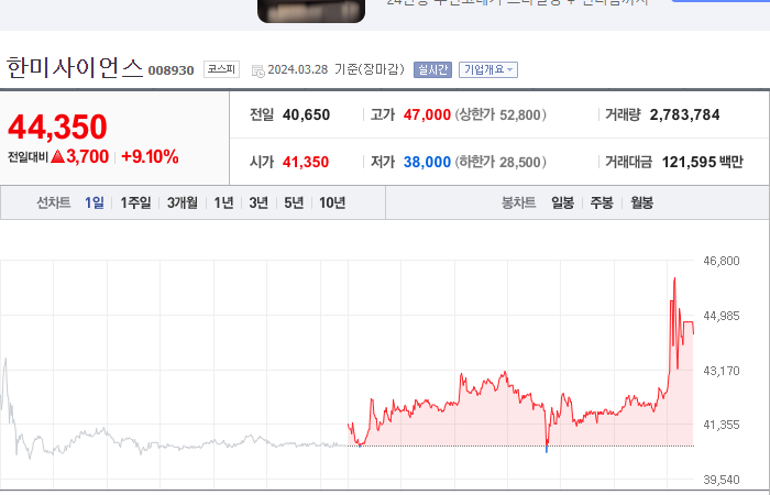 현재가: 44,350, 어제대비:+3,700시총: 3조 1,026억원, 거래량:2,783,784, 거래대금:121,595백만
