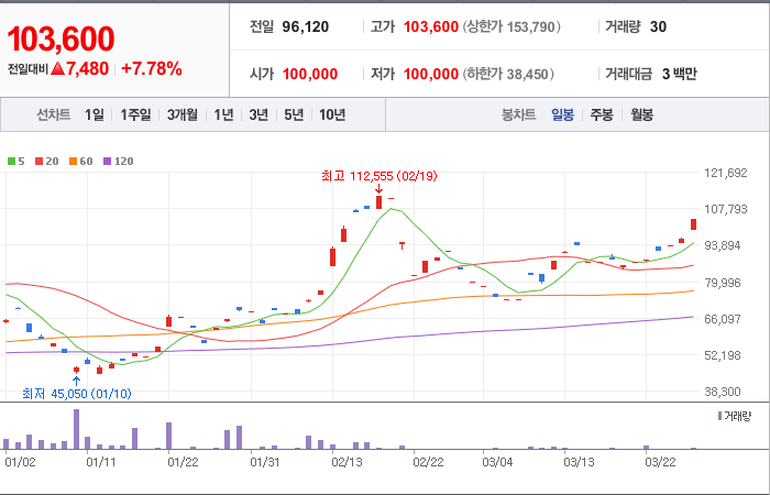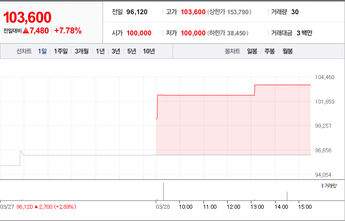 현재가: 103,600, 어제대비:+7,480시총: 1,036억원, 거래량:30, 거래대금:3백만