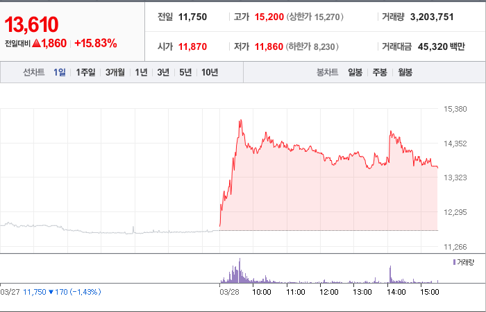 현재가: 13,610, 어제대비:+1,860시총: 2,320억원, 거래량:3,203,751, 거래대금:45,320백만