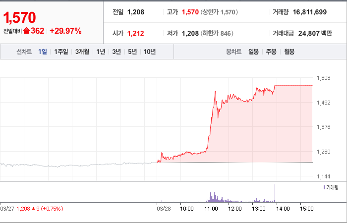 현재가: 1,570, 어제대비:+362시총: 935억원, 거래량:16,811,699, 거래대금:24,807백만