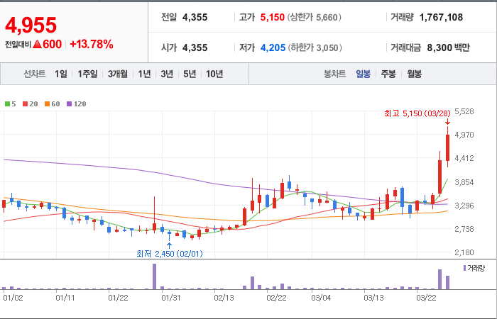 현재가: 4,955, 어제대비:+600시총: 1,171억원, 거래량:1,767,108, 거래대금:8,300백만