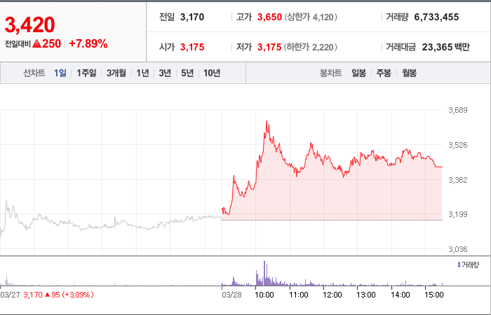 현재가: 3,420, 어제대비:+250시총: 2,397억원, 거래량:6,733,455, 거래대금:23,365백만