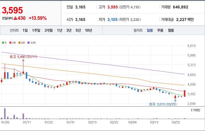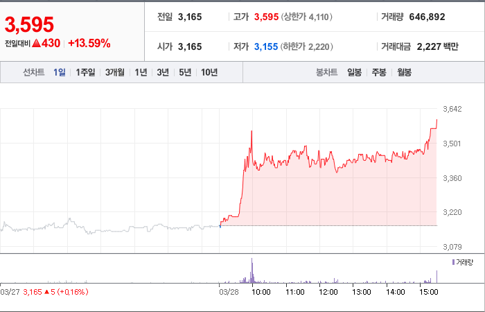 현재가: 3,595, 어제대비:+430시총: 1,813억원, 거래량:646,892, 거래대금:2,227백만